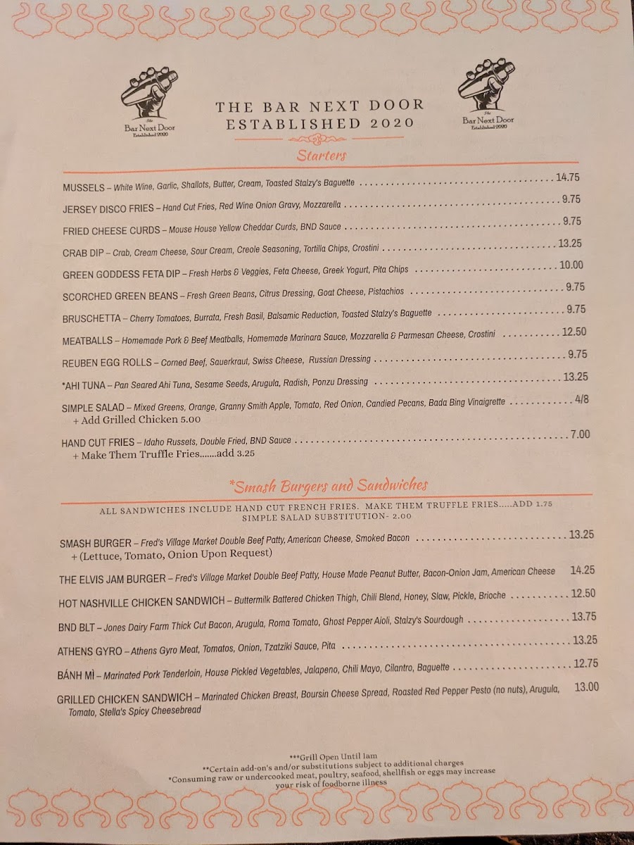 The menu at The Bar Next Door offers a relaxed and approachable selection, ideal for casual dining and laid-back gatherings. It’s the kind of place where you can enjoy thoughtfully prepared comfort food and satisfying drinks without fuss. The dishes lean into familiar favorites like their well-regarded smash burger paired with handcut truffle fries, or the flavorful Hot Nashville Chicken Sandwich, providing hearty options to complement the easygoing atmosphere.